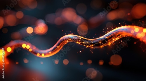 The watermark will not be included on Poster.: Abstract flowing energy line in dark space with glowing particles