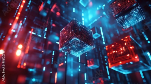 The watermark will not be included on Poster.: Abstract futuristic background with glowing cubes in red and blue light -