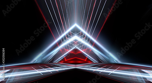 The watermark will not be included on Poster.: Abstract futuristic background - neon lines, triangle, pyramid - empty dark scene with lines and rays,