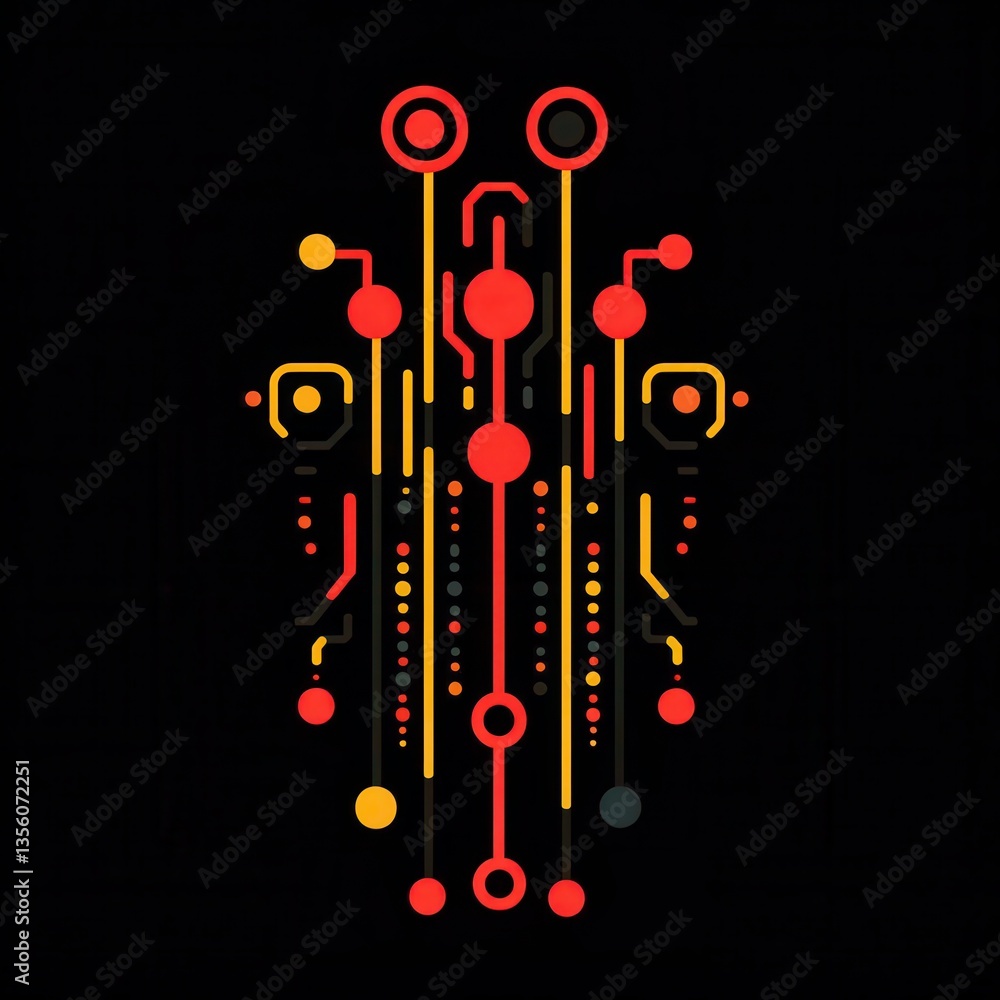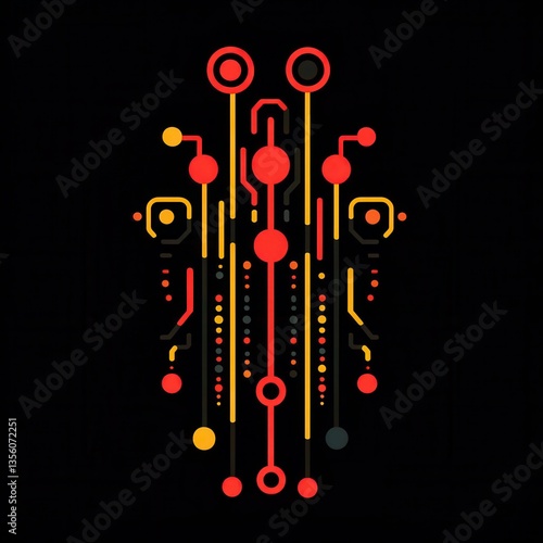Abstract geometric design with red and yellow circuits against black background for technology and dPoster