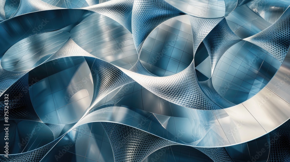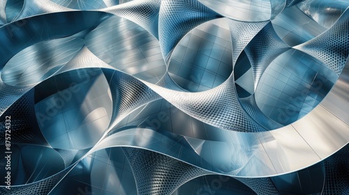 The watermark will not be included on Poster.: Abstract geometric patterns of intersecting lines and circles in shades of blue and silver, creating