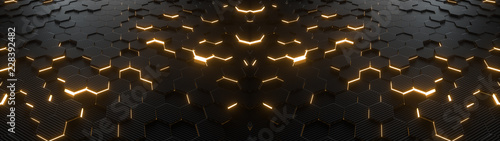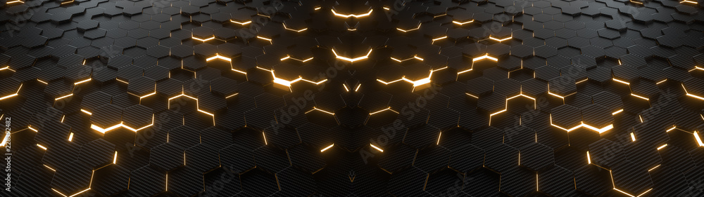 Poster abstract hexagonal geometric ultra wide background. structure of lots of hexagons of carbon fiber wi