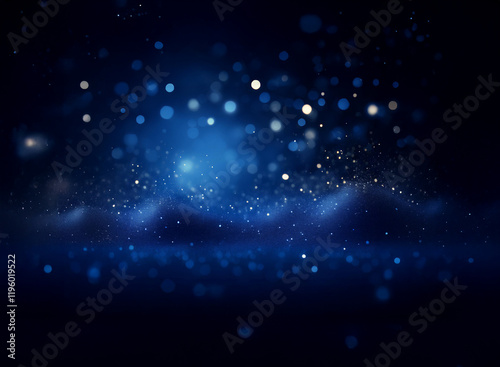 The watermark will not be included on Poster.: Abstract image of a dark blue, almost black, background with glowing particles and bokeh lights crea
