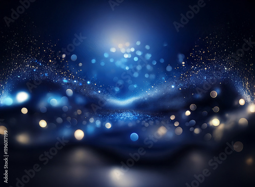 Poster abstract image of a dark blue, glittering, ethereal landscape. shimmering particles and bokeh effect