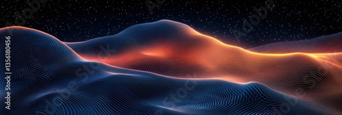 Abstract landscape with flowing lines and glowing colors, featuring a starry sky, creating a surrealPoster