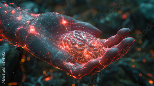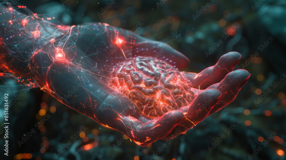 The watermark will not be included on Poster.: Abstract palm hands touching brain with network connections, innovative technology in science and co