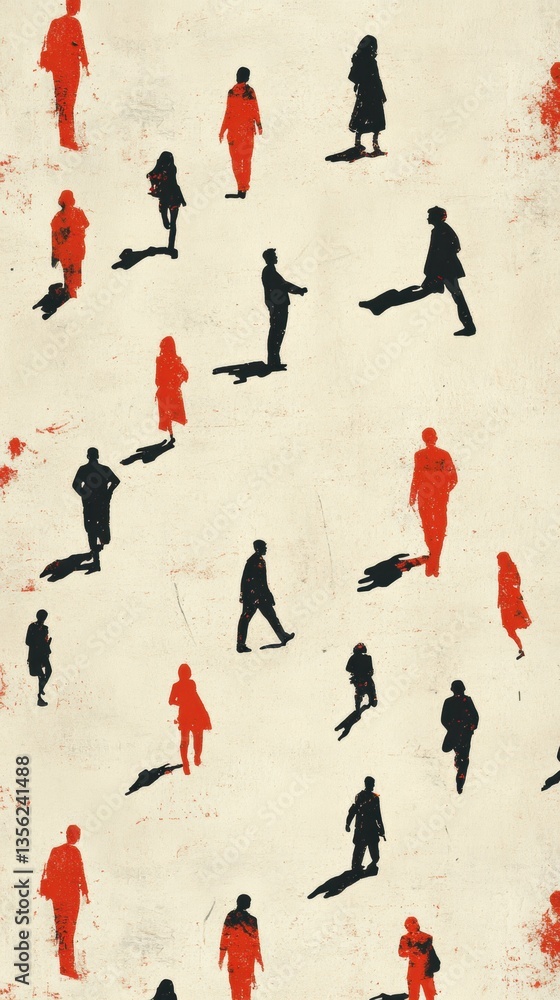The watermark will not be included on Poster.: Abstract pattern with silhouettes of people in black and red colors against a light background for c