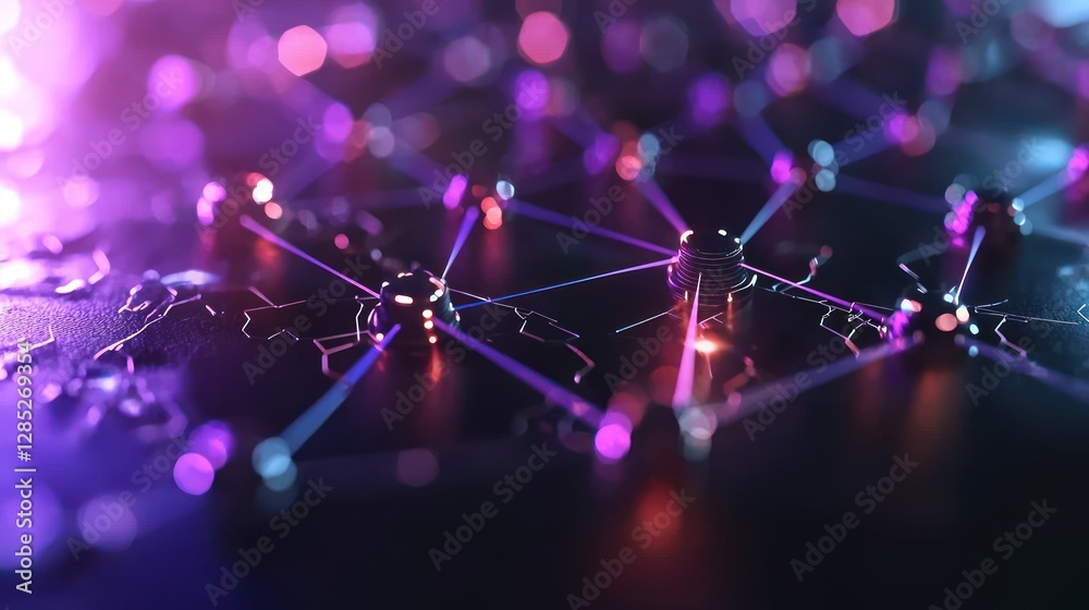 The watermark will not be included on Poster.: Abstract representation of a digital network with glowing connections and nodes in a dark environmen