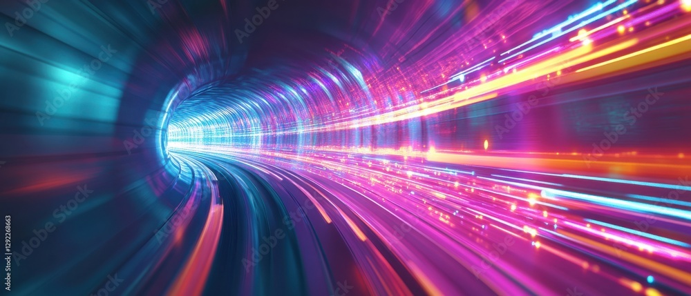 The watermark will not be included on Poster.: Abstract speed motion in a futuristic tunnel with neon light trails, representing data stream, techn