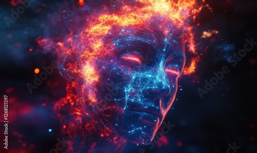The watermark will not be included on Poster.: Abstract visualization of a glowing brain with vibrant neural connections, dynamic red and blue tone