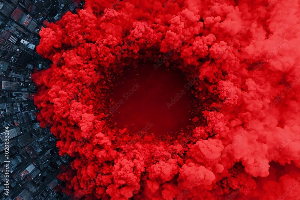 The watermark will not be included on Poster.: Aerial view of vibrant red smoke swirling in a circular pattern, creating a dramatic and captivating