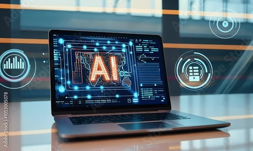 Poster ai technology concept with laptop and hologram icon of artificial intelligence, text ai on the scree - Posters Poster ai technology concept with laptop and hologram icon of artificial intelligence, text ai on the scree - Posters
