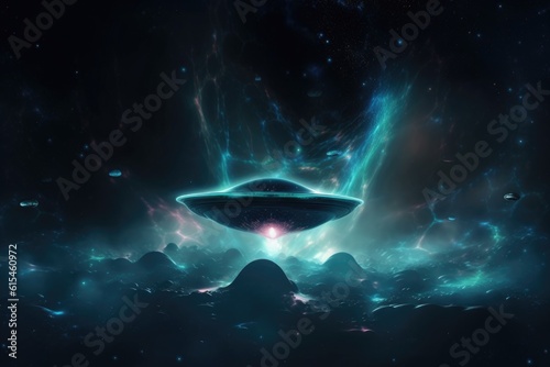 Poster alien life form, with view of the stars and galaxies, floating in space, created with generative ai