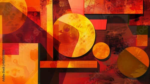 The watermark will not be included on Poster.: An abstract composition of geometric shapes, featuring 3d blocks and circles intersecting with squar