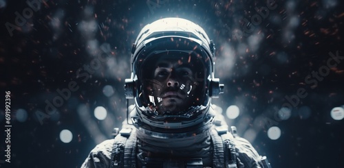 Poster an astronaut is shown in his spacesuit with space on the background