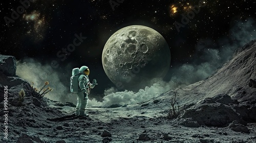 The watermark will not be included on Poster.: An astronaut standing on a rocky alien planet with a large moon in the background