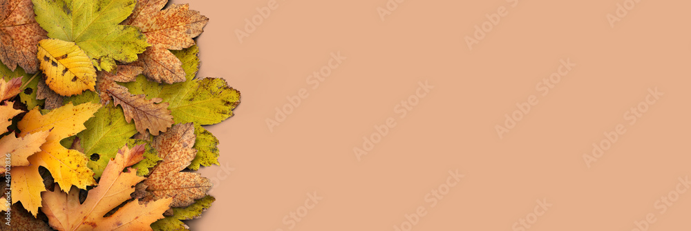 Poster an autumn background of leaves on the left edge as a border, frame for a seasonal message isolated a