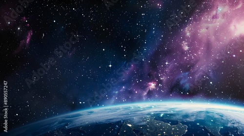 Poster : An image showing earth from space with a starry cosmos background, illustrating a space exploration