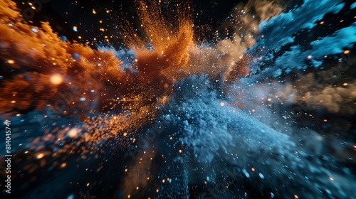 The watermark will not be included on Poster.: An immersive and captivating illustration of abstract blue and orange color powder exploding in a bu