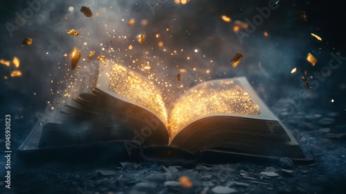 The watermark will not be included on Poster.: An open book with a glowing magical light emanating from its pages, surrounded by golden particles a
