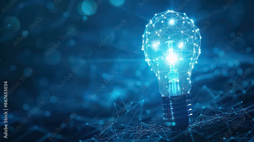 Artificial intelligence data digital innovation, abstract blue glow light bulb on dark blue backgrouPoster