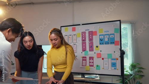 Asian uiux designers collaborate in an office setting, focusing on a mobile application project - thePoster