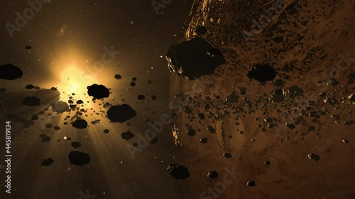 The watermark will not be included on Poster.: Asteroids in space - computer generated footage of the asteroid belt with planet and bright sunlight