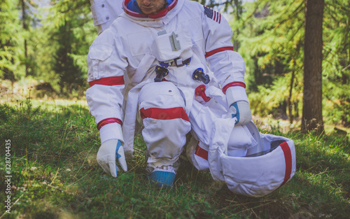 The watermark will not be included on Poster.: Astronaut exploring a new planet - searching for a new home for humanity - concept about science and n
