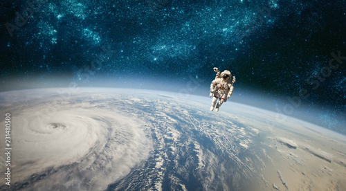 Poster astronaut in outer space against the backdrop of the planet earth. typhoon over planet earth. - Posters Poster astronaut in outer space against the backdrop of the planet earth. typhoon over planet earth. - Posters
