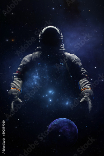 Poster astronaut in spacesuit helmet is a reflection of stars and galaxies. space exploration, an astronaut