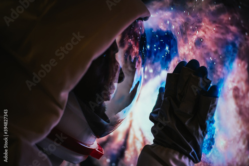 Poster : Astronaut looking deep space, galaxy and planets from the window of his capsule - concept about scien