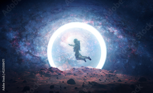 The watermark will not be included on Poster.: Astronaut on alien planet entering spacetime portal light