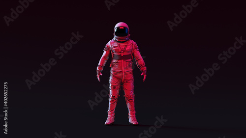 The watermark will not be included on Poster.: Astronaut with black visor and simple retro silver spacesuit with pink and white moody 80s lighting