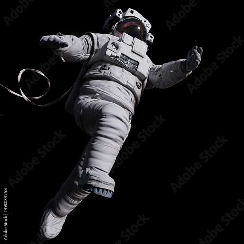 The watermark will not be included on Poster.: Astronaut with safety tether in outer space, isolated on black background