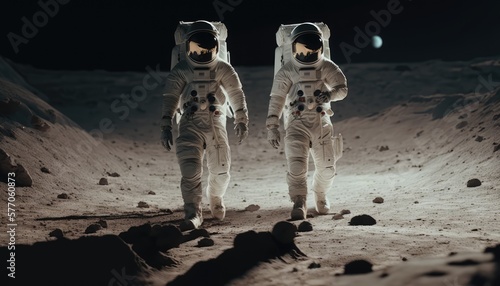 Poster astronauts walking on the moon surface watching earth, made with generative ai