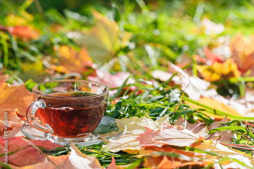 The watermark will not be included on Poster.: Autumn picnik with pakk with red maple leaves