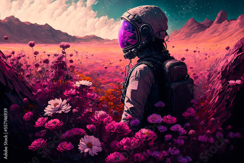 The watermark will not be included on Poster.: Beautiful astronaut sitting in in a field of flowers on a different planet - generative ai