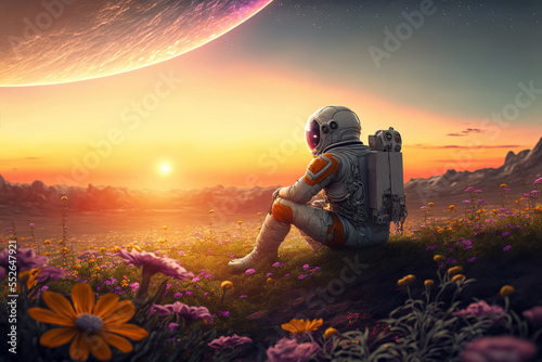 Poster beautiful astronaut sitting in in a field of flowers on a different planet. generative ai