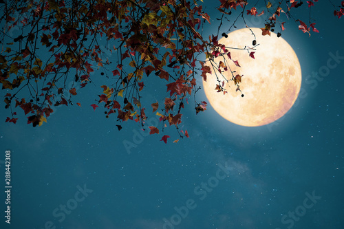 Poster : Beautiful autumn fantasy - maple tree in fall season and full moon with star - retro style with vinta