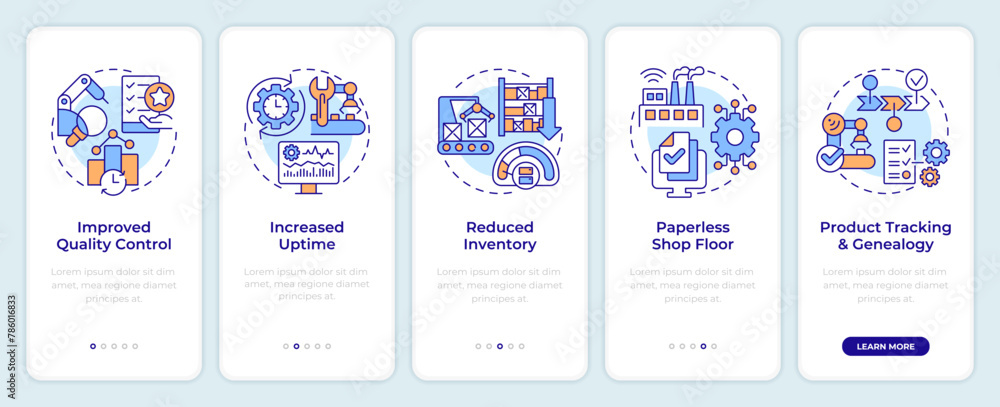 Poster benefits of mes onboarding mobile app screen. quality control. walkthrough 5 steps editable graphic