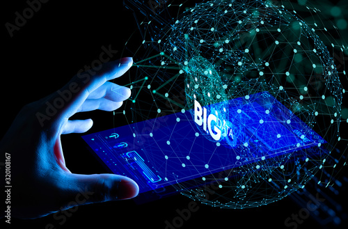 The watermark will not be included on Poster.: Big data world and globe smart pohone ui with hand selecting and pressing big data symbol and modern