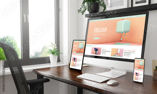 Black and white desktop with three devices showing creativity tutorials websitePoster