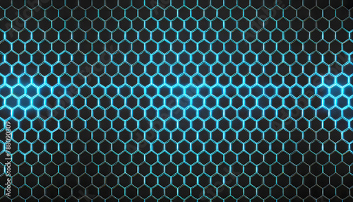 Poster black background with blue neon hexagon grid. glowing hex background. generative ai.