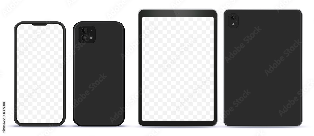 Poster black mobile phone and tablet computer mock-up with front and back side view.