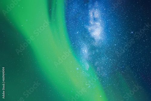 Poster : Blue night starry sky - milky way, polar lights - green aurora borealis