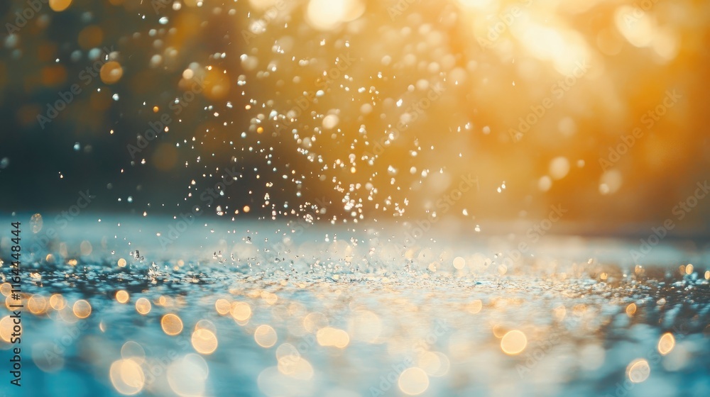 Poster : Bokeh blur background with sparkling raindrops reflecting warm sunlight creating an ethereal and dre