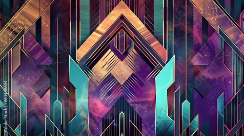 The watermark will not be included on Poster.: Bold angular patterns in bronze and deep purple highlighted by glowing teal gradients for art deco s
