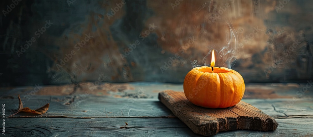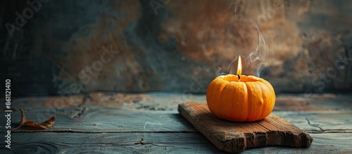 Burning candle in an orange pumpkin on a wooden board - copy space image - place for adding text and dPoster