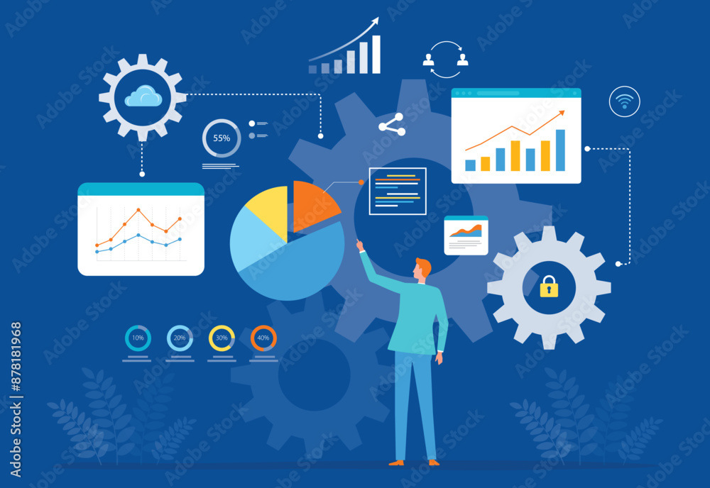 The watermark will not be included on Poster.: Business data analytics design concept - people standing on the report graph dashboard background - fl