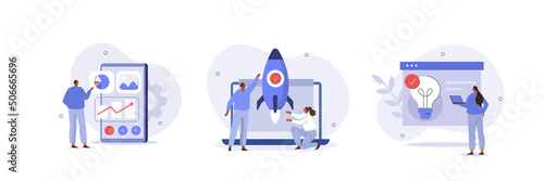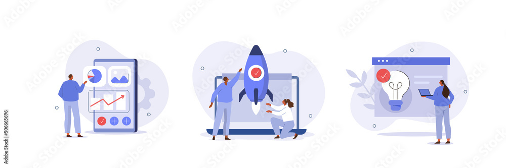 The watermark will not be included on Poster.: Business illustration set - characters planning, prototyping and testing startup ideas and analyzing